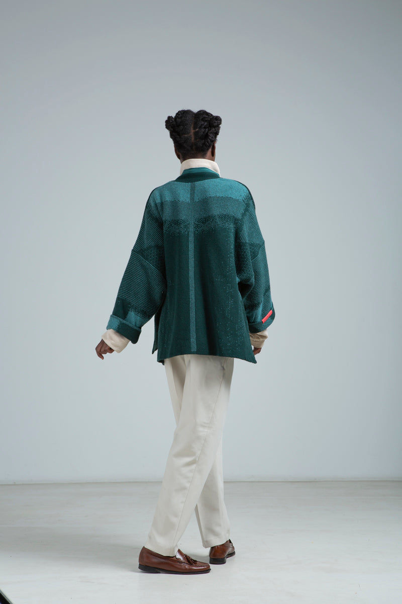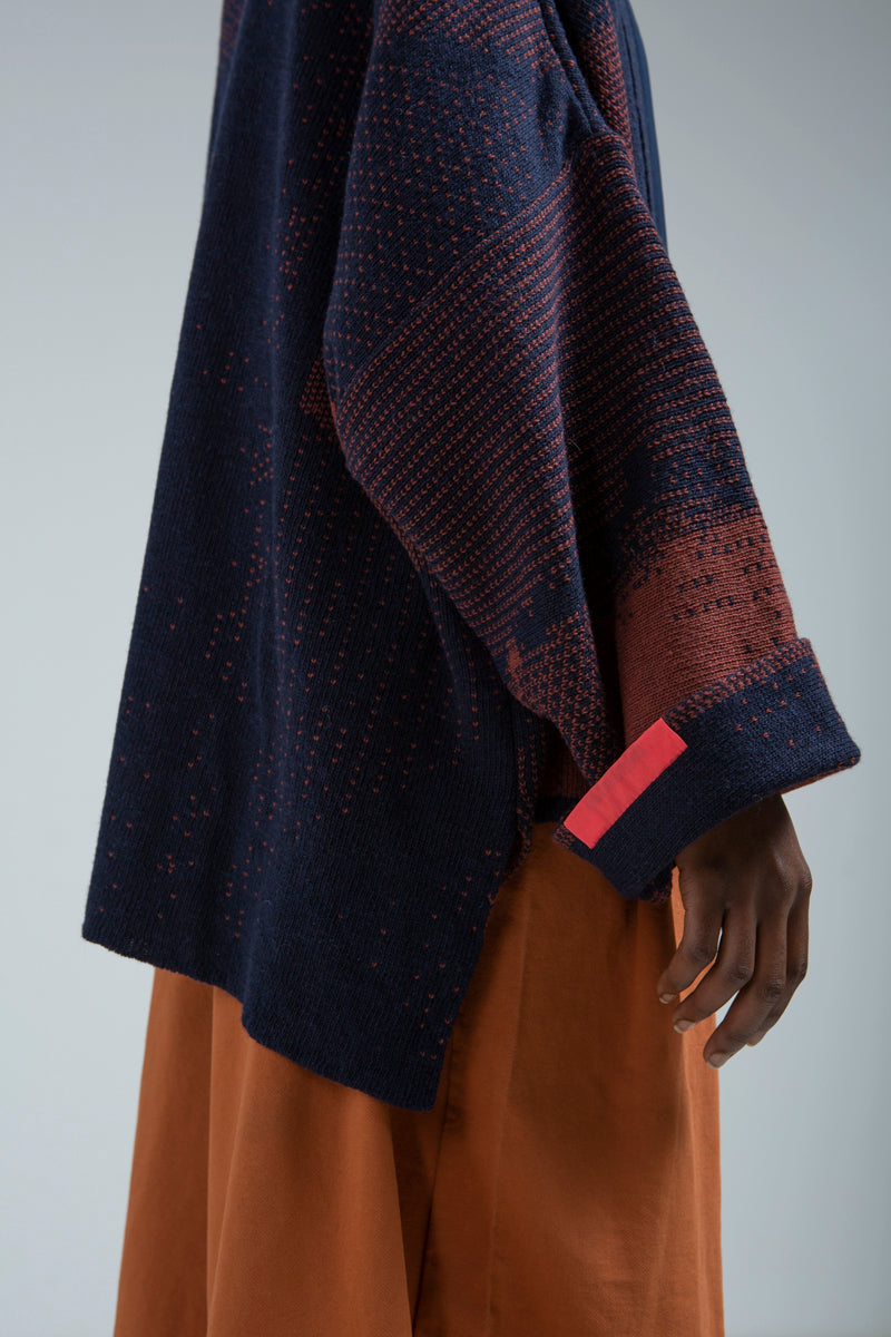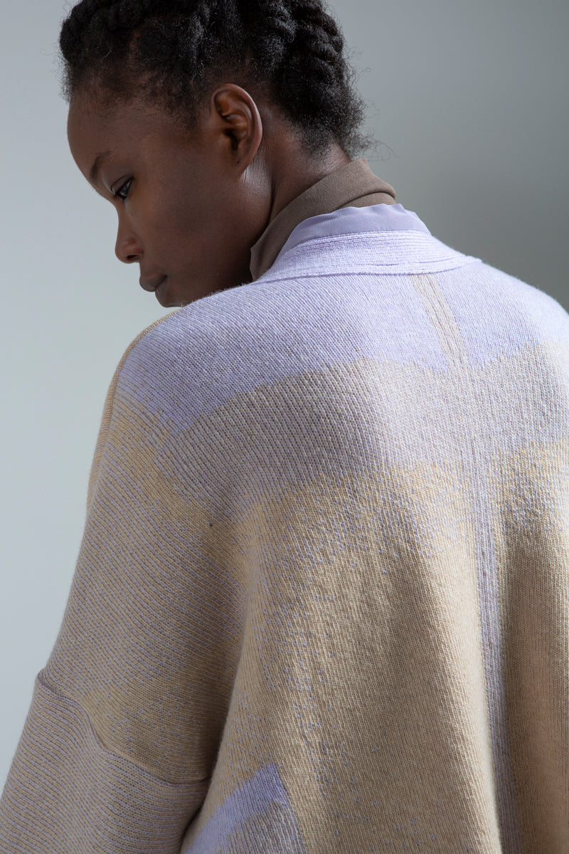 De kimono is een verfijnd kledingstuk, gebreid in delicate jacquard met een zijden afwerking rond de kraag en mouwen. Het heeft hetzelfde dessin als de sjaals uit de ‘Lieux de Mémoire’ collectie en is geïnspireerd door een 100 jaar oude kimono die Griet in New York kocht. Details, zoals de achternaad en de mouwinzet, zijn vertaald naar dit nieuwe kledingstuk. Alsook, een kraag van puur zijde en een koraalrood accent rond één van de mouwuiteinden.