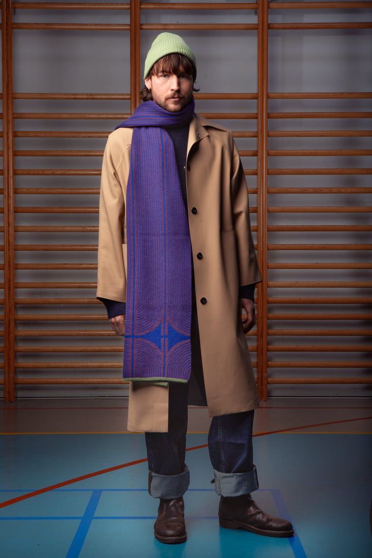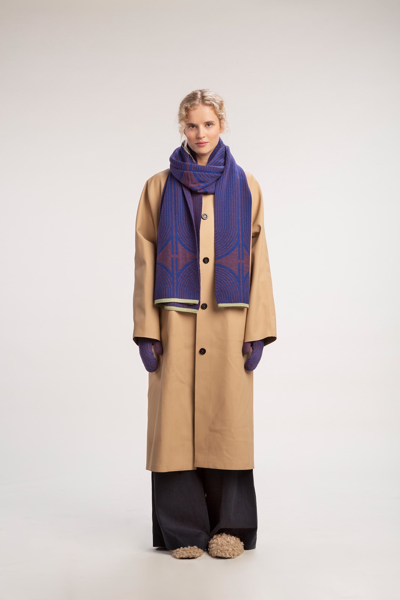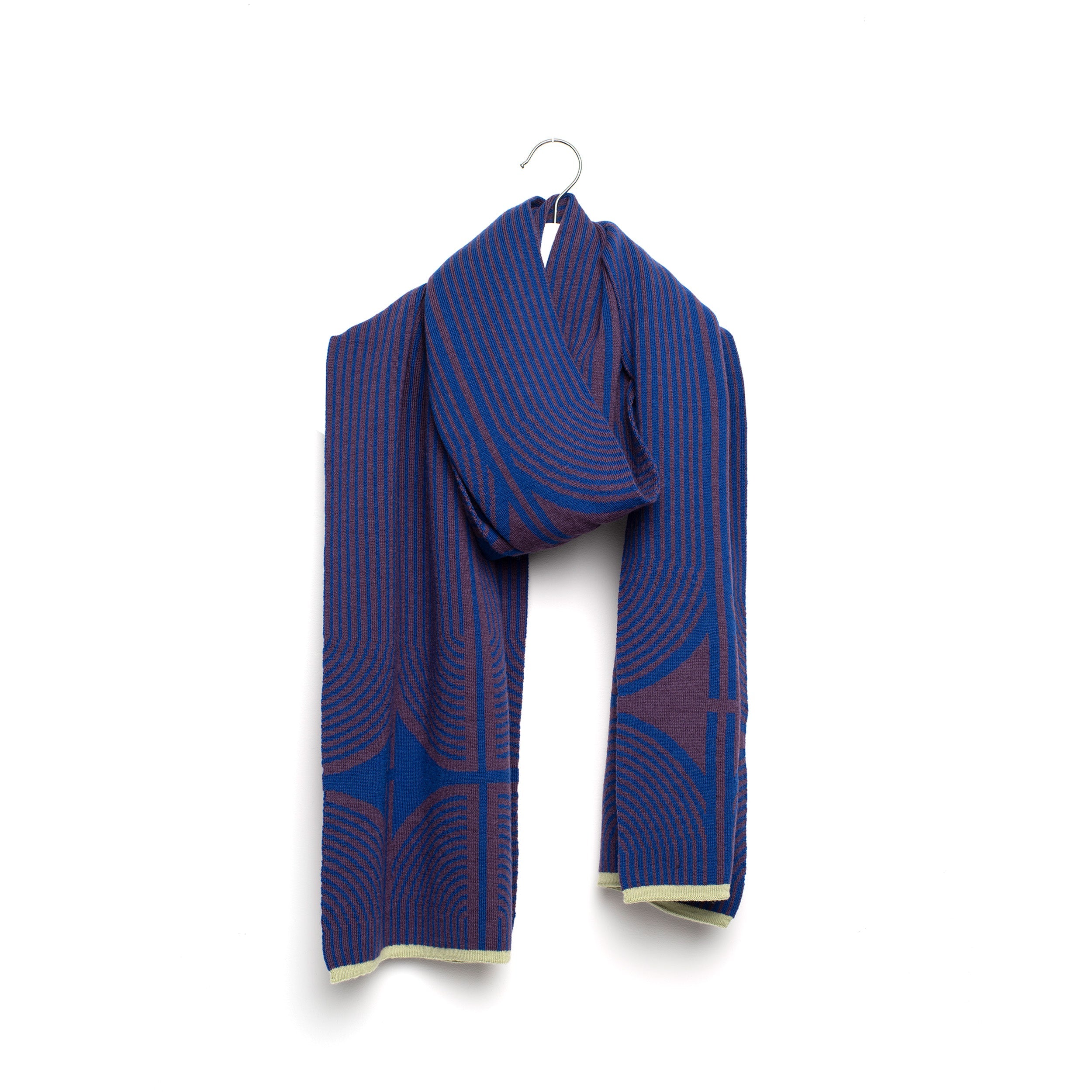 ANNI is een ultrazachte jacquard gebreide sjaal uit 100% extra fijne merinowol, met een op Bauhaus-geïnspireerd ontwerp dat aan beide kanten zichtbaar is.