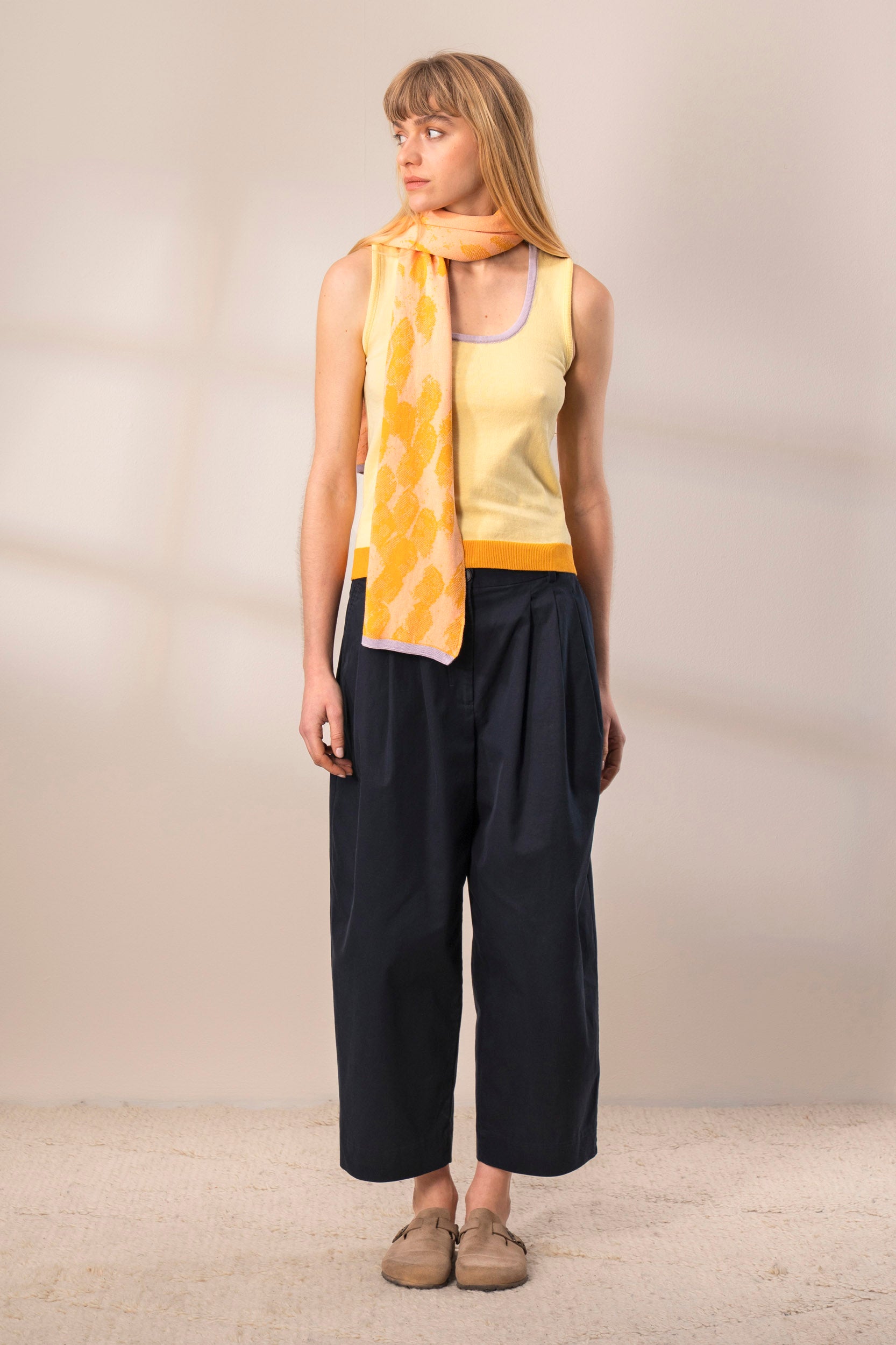SATURNI sjaal is een lichte jacquard gebreide sjaal van 100% biologisch katoen. Het omkeerbare design is aan beide kanten zichtbaar, waardoor je twee looks in één hebt.